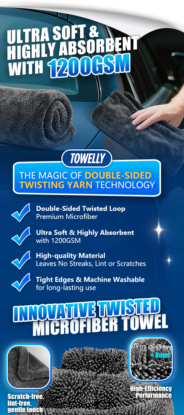 Descoperă performanța superioară a prosopului Towelly, cu tehnologie dublu strat și fire răsucite (Twisted Yarn), plus o grosime impresionantă de 1200 GSM.